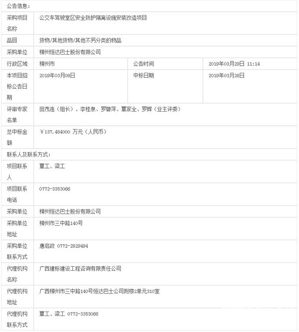 广西建标建设工程咨询有限责任公司受柳州恒达巴士股份有限公司的委托,就“公交车驾驶室区安全防护隔离设施安装改造项目”项目(项目编号:GXJB-LZ-2019-12)组织采购,评标工作已经结束,中标结果如下: