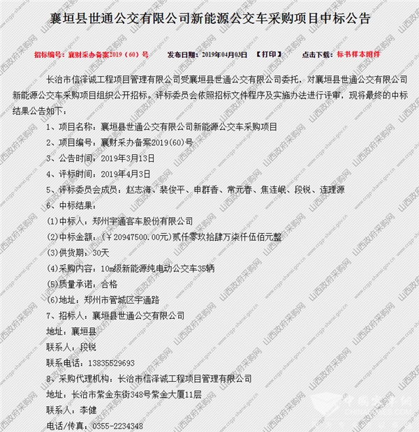 山西长治襄坦县世通公交有限公司新能源公交车采购项目中标公告