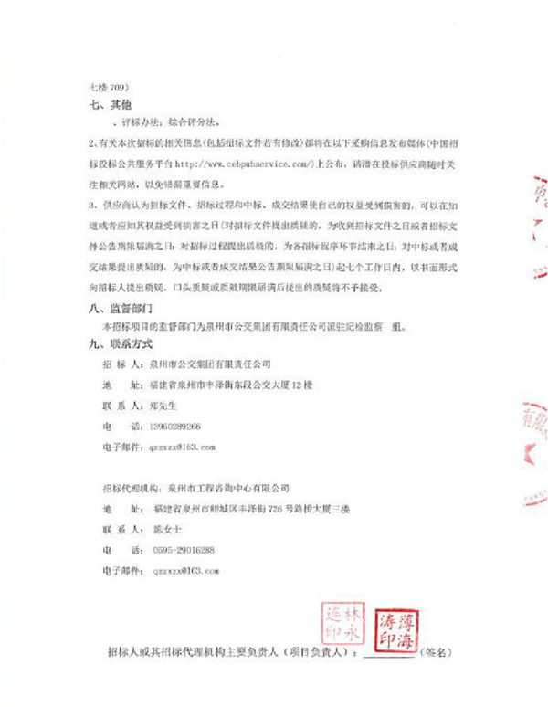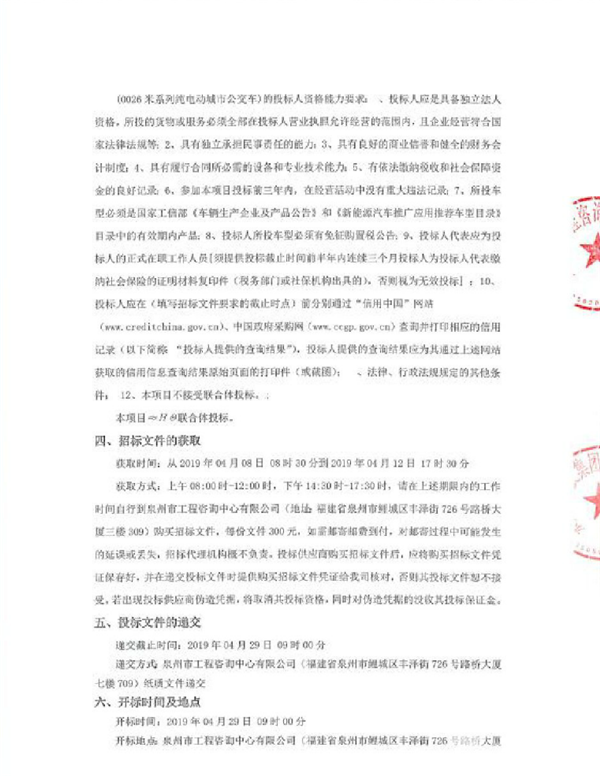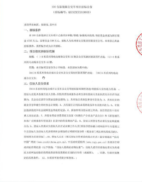 福建泉州市公交集团有限公司100辆新能源公交车项目招标公告