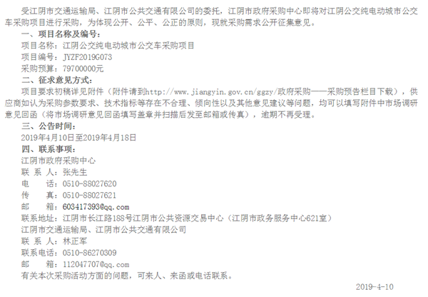 江阴公交纯电动城市公交车采购项目采购需求意见征集公告