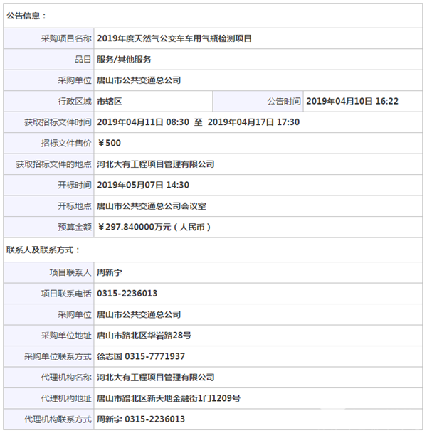 唐山公共交通总公司2019年度天然气公交车车用气瓶检测项目公开招标公告