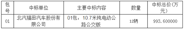 01包:10.7米纯电动公路公交版 数量:12辆 (预算价: 996万元)
