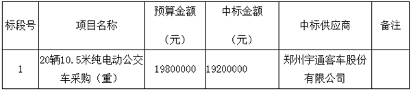 温州德臻招标代理有限公司就温州市交通运输集团有限公司20辆10.5米纯电动公交车采购(重)项目进行公开招标方式国有企业采购(招标编号:WZDZCG-2019030801Z),本项目于2019年3月29日发布招标公告,2019年4月15日于温州市行政审批与公共资源交易服务管理中心2号评标室进行评审,经评标委员会综合评定,确定此次中标供应商为: