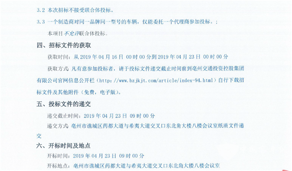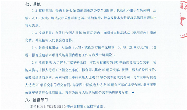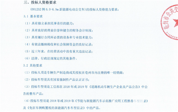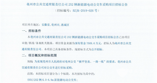 亳州市公共交通有限责任公司252辆新能源电动公交车采购项目招标公告