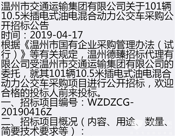 - 深圳巴士集团发布100辆10.5米低地板纯电动公交车采购招标公告
