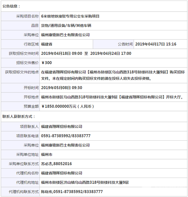 福州康驰新巴士有限责任公司6米级地铁接驳专用公交车采购项目招标公告