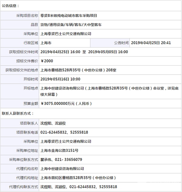 上海奉贤巴士公交公司奉贤8米级纯电动城市客车采购项目公开招标公告