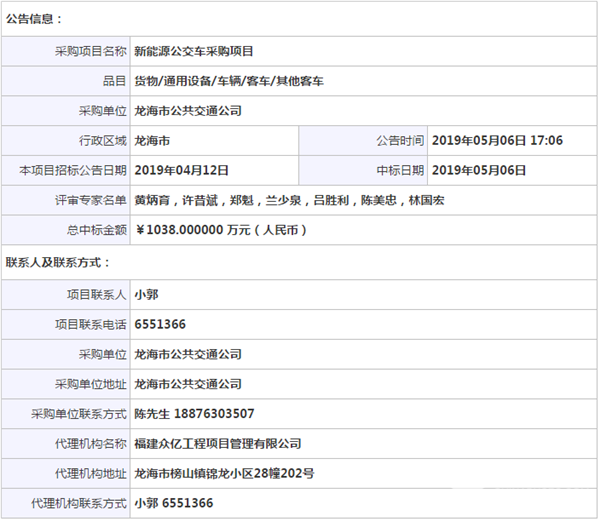 福建省龙海市公共交通公司新能源公交车采购项目中标公告