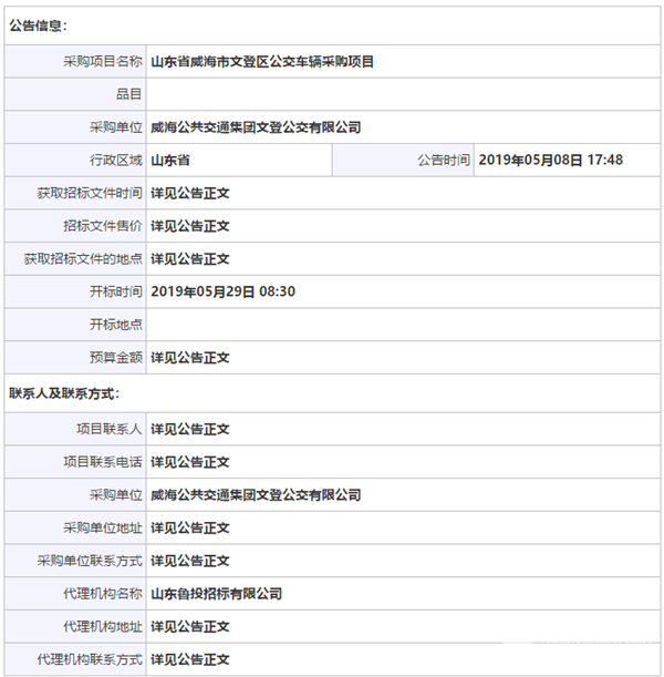 山东省威海市文登区公交车辆采购项目招标公告