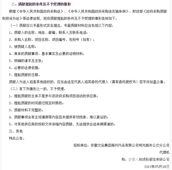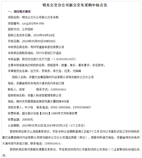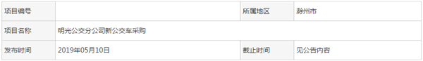 安徽省滁州市明光公交分公司新公交车采购中标公告