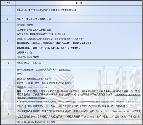四川省雅安市公共交通有限公司纯电动公交车采购项目招标公告