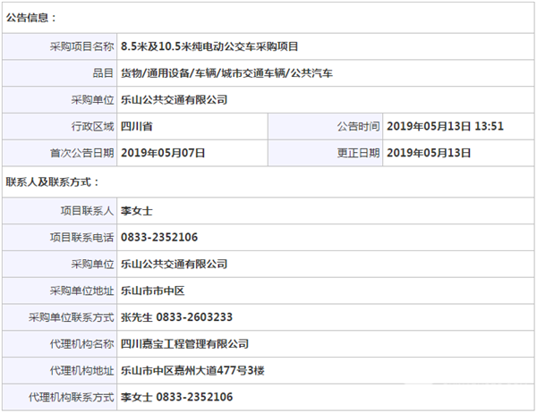 四川省乐山公共交通有限公司8.5米及10.5米纯电动公交车采购项目更正公告