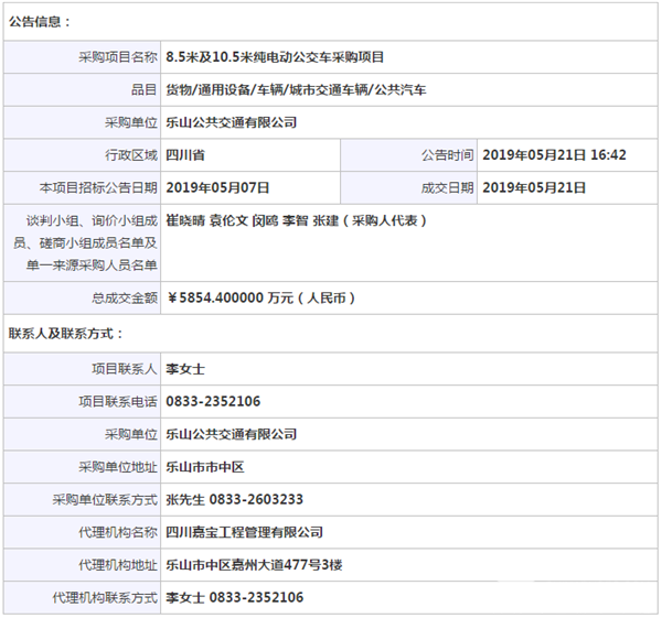 四川省乐山公共交通有限公司8.5米及10.5米纯电动公交车采购项目成交公告