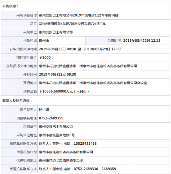 广东惠州交投巴士有限公司2019年纯电动公交车采购项目公开招标公告