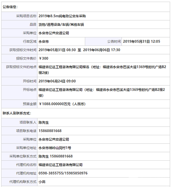 福建省永安市公共交通公司2019年8.5m纯电动公交车采购公开招标公告
