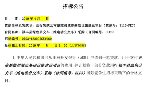 亚行贷款云南楚雄州城市基础设施建设项目楚雄市绿色公交车(纯电动公交车)(ECX4)采购国际竞争性招标