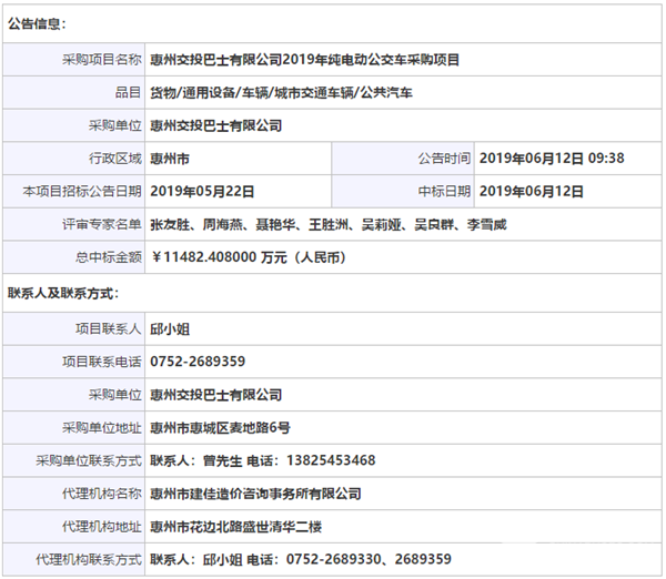 广东省惠州交投巴士有限公司2019年纯电动公交车采购项目中标公告