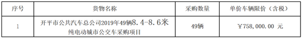 开平市公共汽车总公司2019年49辆8.4-8.6米纯电动城市公交车采购项目招标公告