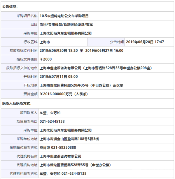 上海太阳岛汽车出租服务有限公司纯电动公交车采购项目招标公告