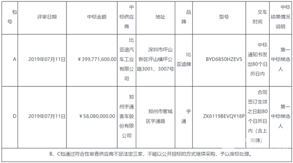 经评标委员会评审,A包推荐比亚迪汽车工业有限公司为第一中标候选人;D包推荐郑州宇通客车股份有限公司为第一中标候选人。