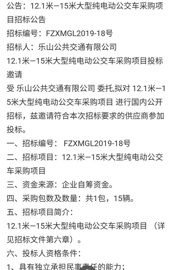 四川省乐山公交公司12.1米-15米大型纯电动公交车采购项目招标公告