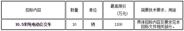 温州交运集团汽车服务有限公司10.5米纯电动公交车采购,招标内容及要求如下: