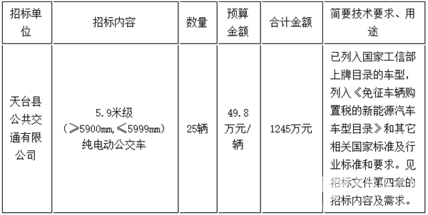 浙江省台州市天台县公交公司纯电动公交车采购项目(第三次)招标公告