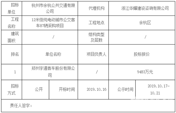 浙江杭州余杭公交公司12米级纯电动公交车87辆采购项目拟中标公示