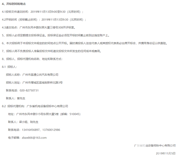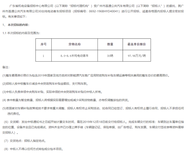 广东省广州市荔通公共汽车有限公司30台纯电动客车招标公告