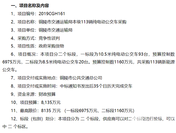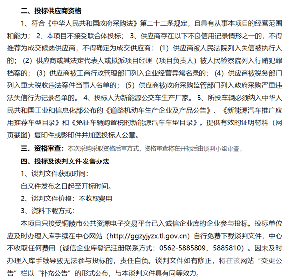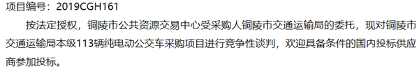 安徽省铜陵市交通运输局本级113辆纯电动公交车谈判招标公告