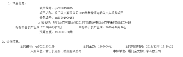 安徽省黄山市祁门公交有限公司2019年新能源电动公交车采购项目合同公示