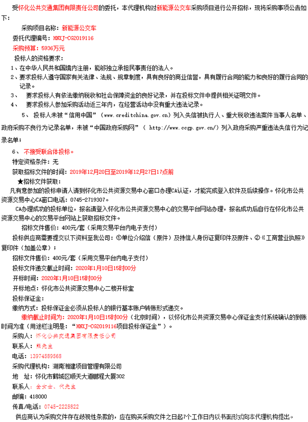 湖南省怀化市公共交通集团有限公司新能源公交车采购招标公告