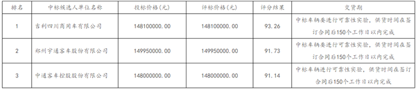 全部投标单位:吉利四川商用车有限公司,郑州宇通客车股份有限公司,中通客车控股股份有限公司,北汽福田汽车股份有限公司,南京金龙客车制造有限公司,广西申龙汽车制造有限公司