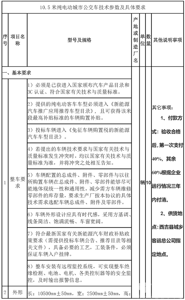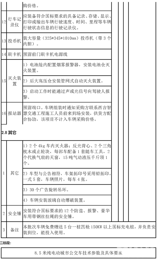 1.2标段划分:共划分2个标段; Ⅰ标段为10.5米纯电动公交车,Ⅱ标段为8.5米纯电动公交车。