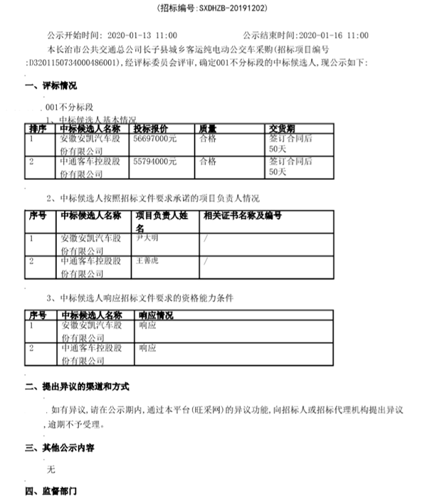 山西省长治市公共交通总公司长子县城乡客运纯电动公交车采购中标公示