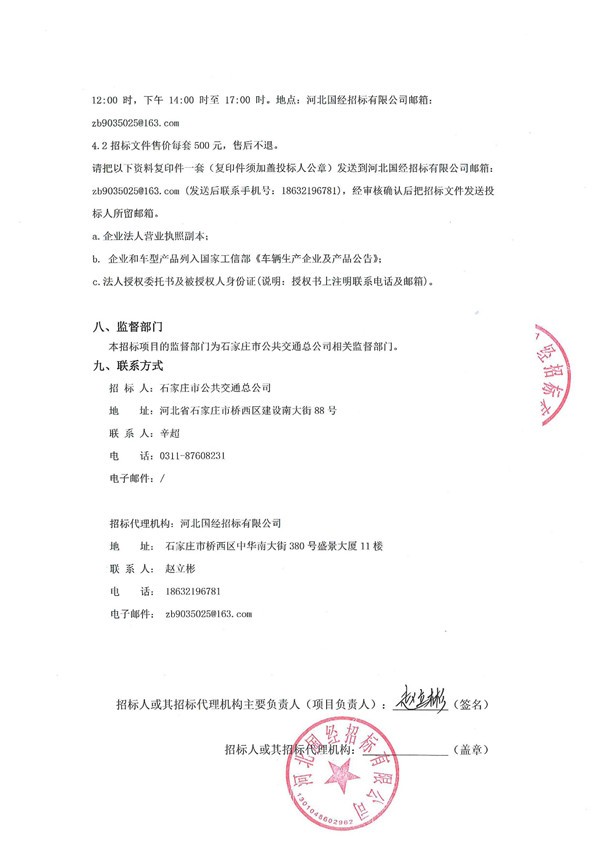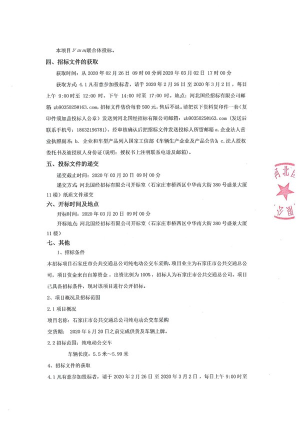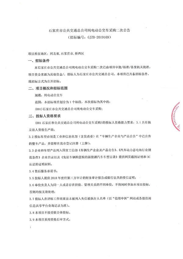 河北省石家庄市公共交通总公司纯电动公交车采购二次公告