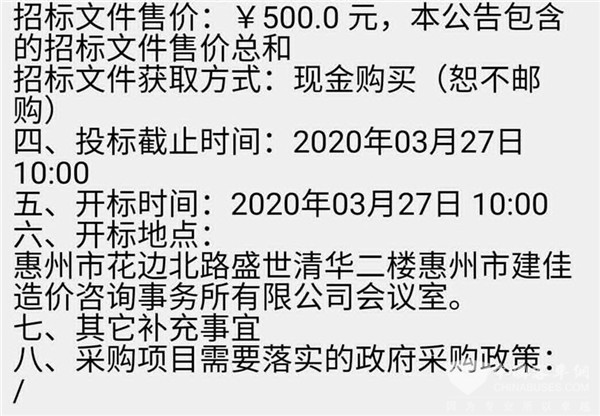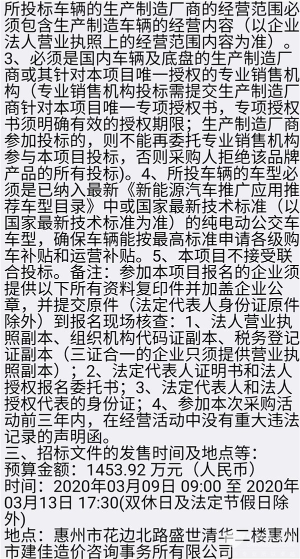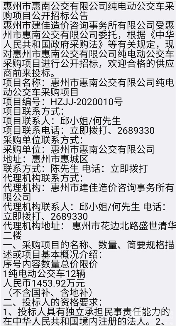 广东省惠州市惠南公交有限公司纯电动公交车采购项目招标公告