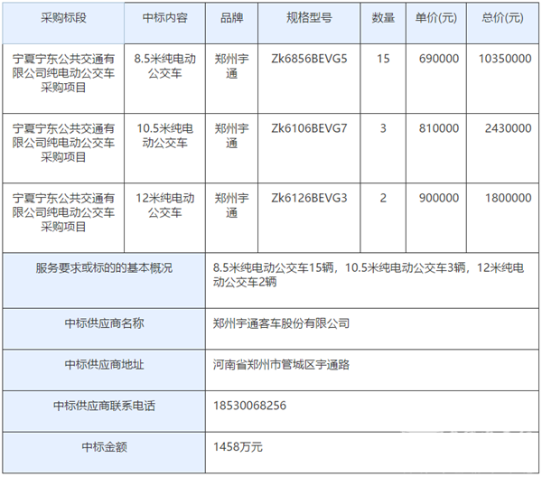 宁夏宁东公共交通有限公司纯电动公交车采购项目中标公告