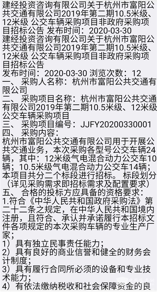 - 广西贵港市公交公司购置100辆新能源公交车项目中标公告