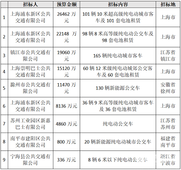 据完美作业网有免费视频汇总,本周招标看点当属上海浦东新区公共交通有限公司、上海崇明巴士公共交通有限公司、镇江市公共交通有限公司以及滁州市公共交通有限公司的超亿元招标项目。其中,上海浦东新区公交公司本周公布了三次招标项目,分别为101辆10米超高级纯电动城市客车及电池租赁采购、98辆8米高等级纯电动公交车及电池租赁采购以及36辆9米高等级纯电动城市客车及电池租赁采购,采购公交车数量总计235辆,预算总金额超5亿元。
