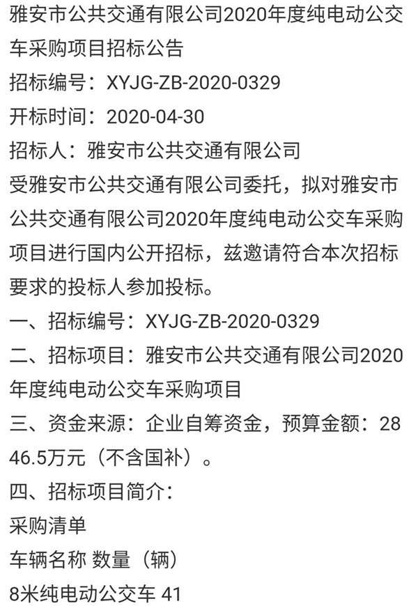 四川省雅安市公交公司2020年纯电动公交车采购项目招标公告