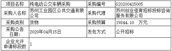江苏省苏州工业园区公共交通有限公司纯电动公交车辆采购公告