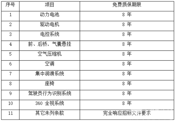 1、我公司承诺三电系统(电池、电机和电控)、前桥总成、后桥总成、气囊悬挂、空气压缩机、空调、座椅和集中润滑、驾驶员行为识别系统、360 全视系统提供八年的免费质保期。