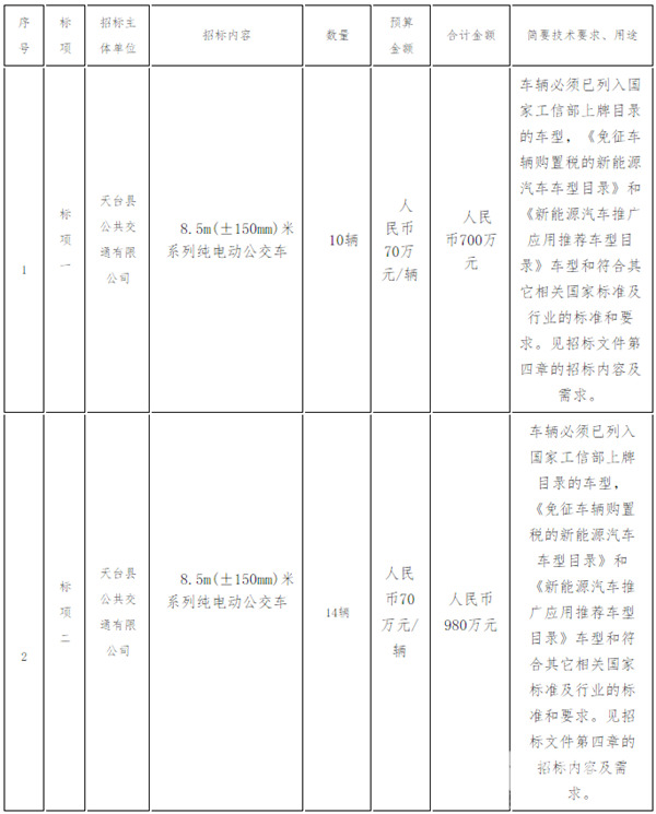 浙江省天台县公共交通有限公司2020年纯电动公交车采购项目招标公告