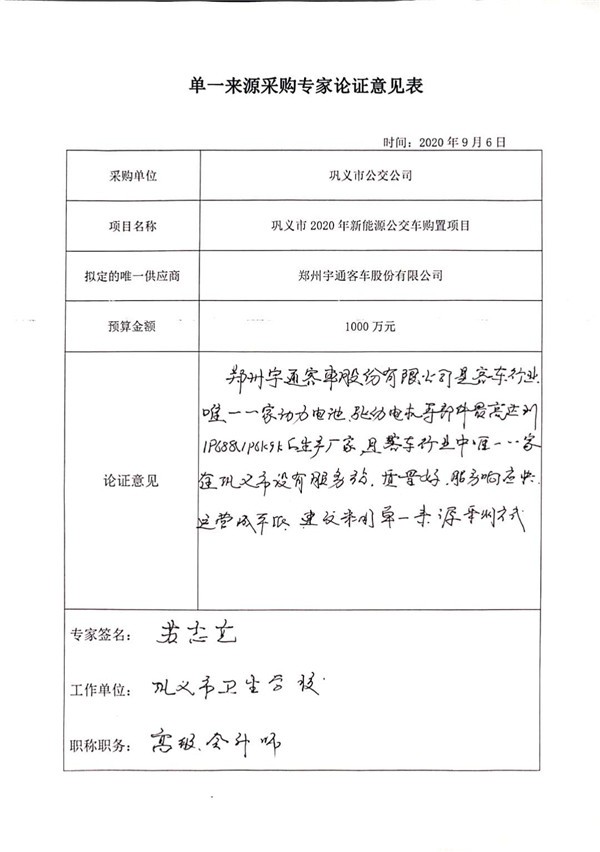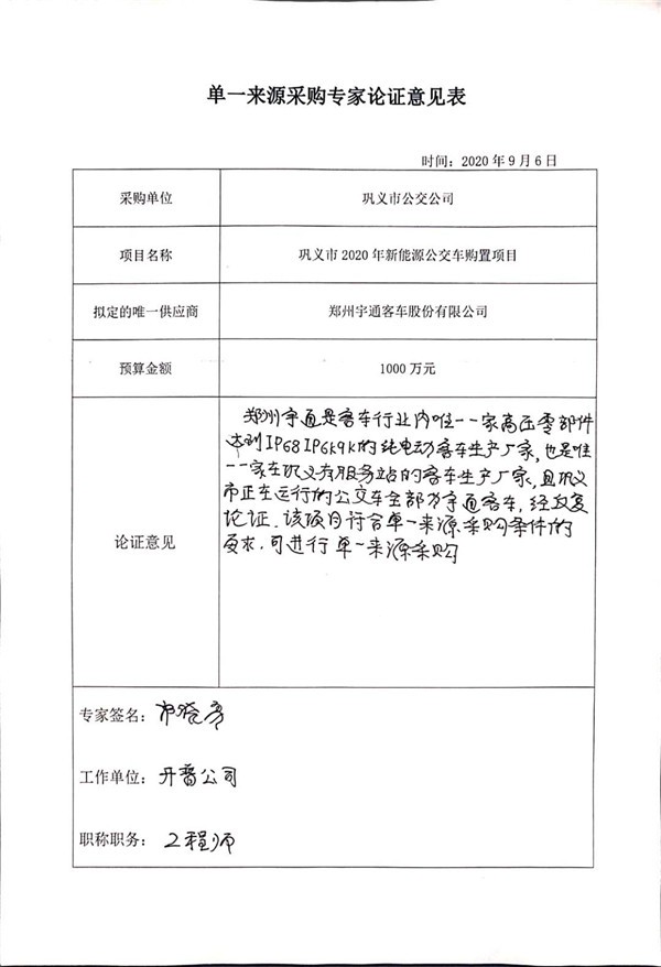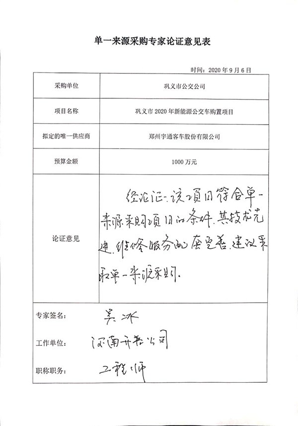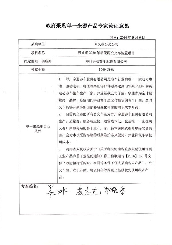 河南省巩义市2020年新能源公交车购置项目单一来源采购公示