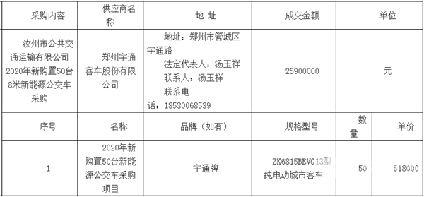 河南省汝州市公交运输公司2020年新购置50台新能源公交车采购项目结果公告