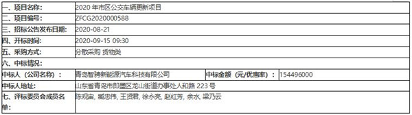 青岛市交通运输局2020年市区公交车辆更新项目中标公告