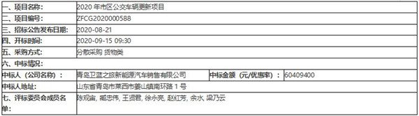 青岛市交通运输局2020年市区公交车辆更新项目中标公告