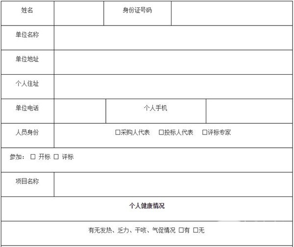 疫情期间参与政府采购活动开评标人员健康信息登记表