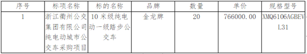 浙江衢州公交集团有限公司纯电动城市公交车采购项目中标公告